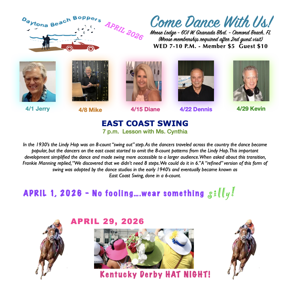 When visiting the Daytona Beach area, this is a great place to Shag/West Coast/East Coast Swing dance and have fun with a friendly group of people. Open dancing Wednesday evenings from 7:30 until 10 pm. Women are encouraged to ask the men to dance. Every dance includes a 50/50 drawing for members and guests. SWEETS and SNACKS are always welcome!