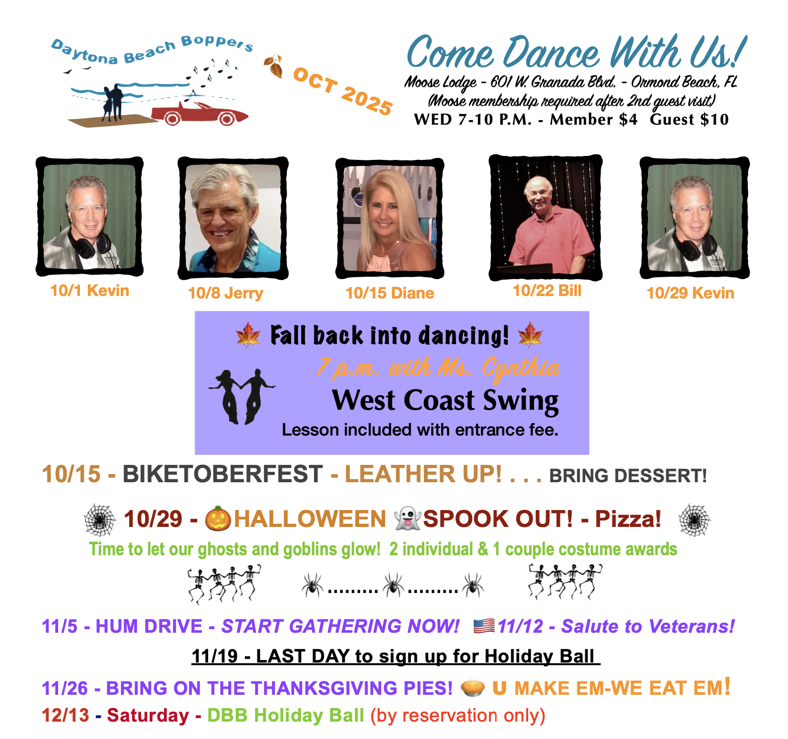 When visiting the Daytona Beach area, this is a great place to dance and have fun with a great group of people.  Open dancing most Wednesday evenings from 7:30 until 10 pm.  Women are encouraged to ask the men to dance.  Every dance includes a 50/50 drawing for members and guests.  SWEETS and SNACKS are always welcome!