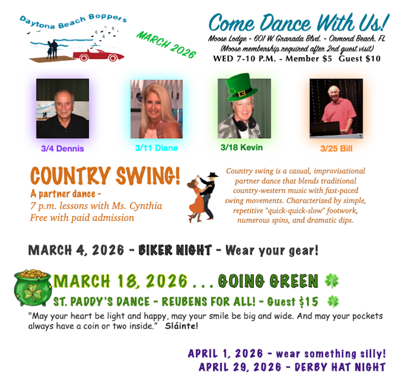 When visiting the Daytona Beach area, this is a great place to Shag/West Coast/East Coast Swing dance and have fun with a friendly group of people. Open dancing Wednesday evenings from 7:30 until 10 pm. Women are encouraged to ask the men to dance. Every dance includes a 50/50 drawing for members and guests. SWEETS and SNACKS are always welcome!
